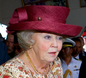 Queen Beatrix, Prince Willem-Alexander and Princess Máxima of the Netherlands have arrived in Brunei for a two-day state visit. For their arrival, Queen Beatrix wore a new dove grey straw hat with double raised bumper brim and a large flower on the side.I usually like Beatrix in hats that are brighter colours but the dove grey perfectly complimented her bright magenta dress.