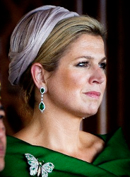Máxima repeated the blush pink straw ruched turban she last wore in April 2011 for William and Kate’s wedding. While the colour was a little washed out, it was a great backdrop for those STUNNING emeralds!