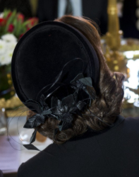 The Turkish state visit to Sweden continued today with a lunch held at the Stockholm City Hall. Queen Silvia, again in mourning dress following the death of Princess Lilian on Sunday, wore a black velvet pillbox hat with a spray of silk leaves and feathers at the back. This hat is smart and elegant, don’t you think?