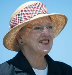 Queen Margrethe and Prince Henrik of Denmark continued their summer cruise tour around Denmark yesterday with a stop in Kerteminde, on the island of Fyn. For this one day visit, Margrethe wore a natural straw hat with a wide band around the crown in the same tartan as her pleated skirt and Henrik repeated his adorable yachting cap. By my archives, Margrethe first wore this hat and skirt combination two years ago when she visited the United Nations in New York. It’s a fine hat that I would like much more if it had a solid coloured ribbon around the crown instead of the plaid band (that’s too much matchy-matchy plaid for me). What do you think?