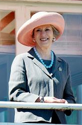 Reader Jelsta forwarded me two royal hats that missed my millinery radar last month (many thanks, Jelsta!). Princess Benedikte of Denmark attended the Copenhagen Racecourse on June 5 to present the “HRH Princess Benedikte Ærespræmieløb” prize. She wore a pale pink straw hat with upturned, rolled brim. I think it might be a pink twin to the navy blue hat she wore in Germany later last month.