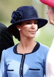 Princess Marie repeated the hat she last wore in May for Prince Nicolai’s confirmation. A close look at this hat (see here) shows it is actually a navy straw fedora with a net veil wrapped around the crown and a silk flower on the side. I like to think of it as a “dressed up” fedora and I like it very much on Marie.
