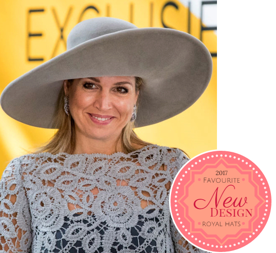 Queen Máxima’s grey felt picture hat with upswept brim by Fabienne Delvigne worn April 7 in Delft