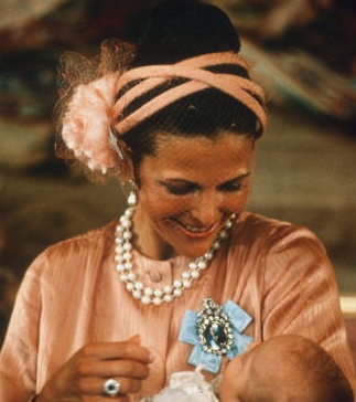 Princess Madeleine, who was named one of Prince Gabriel’s godparents, also made a sentimental touch with her millinery. Her lilac grey twisted silk headpiece with pink silk rose at the back is a clear nod to a similar peach design that Queen Silvia wore on August 31, 1970 for Prince Carl Philip’s baptism (and that Crown Princess Victoria had reinvented in June 2014 for Princess Leonore’s christening). We didn’t get to see the headpiece directly against Madeleine’s printed silk Valentino dress but it looks like it would balance really well.