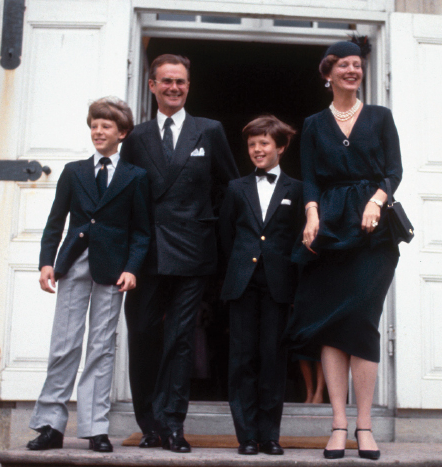 Black calot hat with red flowers, above right; in its original form, below, on May 28, 1981 at Prince Frederik’s confirmation with a black feather pouf on the side