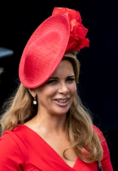 Princess Haya’s red straw sidesweep Philip Treacy saucer with silk roses worn June 2
