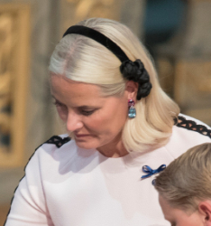Crown Princess Mette Marit wore one of her characteristic headbands, this one a new design in black with small rosettes curving around the ears. Princess Märtha Louise also wore a headband style headpiece in metallic silver. The only hat of the day was worn by Princess Astrid, who repeated her turquoise straw brimless design embellished around one side of the design with with ribbon work flowers.
