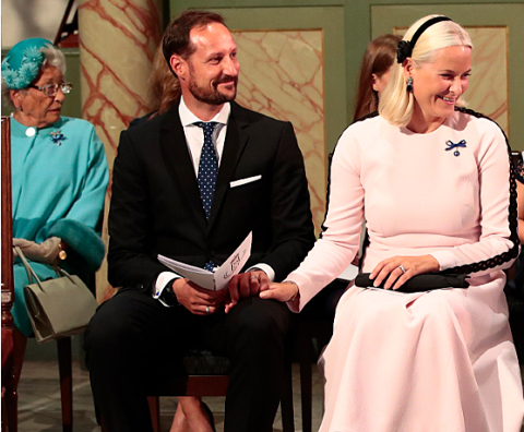 Sonja and Harold look just as in love today as they did 50 years ago! It is disappointing there was only one hat, but I think Astrid looks marvelous in that outfit. The color of the hat and dress look so beautiful against her silver hair. I think Mette-Marit’s headband was a nice contrast to her hair and looked coordinated with the black accents on her dress. I like the idea of Sonja’s dotted veil being a reference to her bridal veil, but wish it was a little more visible.