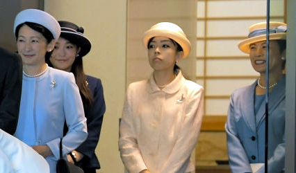 Crown Prince Naruhito departed Japan yesterday for France. He was seen off at the airport by members of the Imperial family including Princess Kiko, Princess Mako, Princess Yoko and Princess Hisako in a coordinated group of cream and blue hats (Crown Princess Masako was also in attendance but did not wear a hat).
