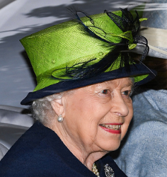 Queen Elizabeth’s lime and navy cloche with feathers and straw leaves worn in Scotland Sep 2