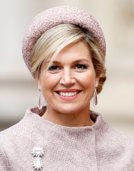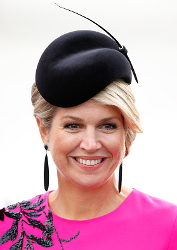 Queen Máxima in a pink patterned bandeau headpiece worn Oct 23 in London