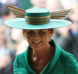 Duchess of York’s emerald straw boater with striped hatband & flying tails by Jess Collett worn Oct 12