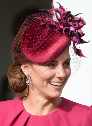 Duchess of Cambridge’s raspberry velvet percher with silk flower spray and veil by Philip Treacy worn Oct 12
