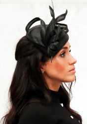 Duchess of Sussex’s black straw teardrop percher with twists by Philip Treacy worn in Australia Oct 20