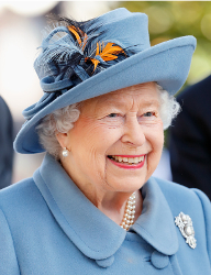 Queen Elizabeth’s blue felt Rachel Trevor Morgan hat with stacked crown, sideswept brim & feather trim worn Oct 20