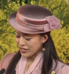 Princess Tsuguko’s dusky pink silk Breton hat with floral trim worn February 15