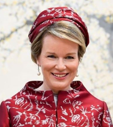 Queen Mathilde’s ruched silk headpiece by Fabienne Delvigne worn March 26
