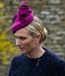 Zara Tindall’s plum felt teardrop percher with feather trim by Juliette Botteril worn Mar 13