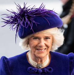Duchess of Cornwall’s purple felt brimless hat with feathers by Philip Treacy worn March 11