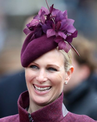 Zara Tindall’s plum felt teardrop percher with feather trim by Juliette Botteril worn Mar 13