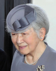 Empress Michiko’s lilac grey rimmed saucer with silk bow and crin underbrim worn March 26