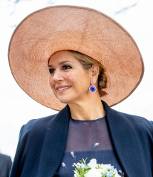 Queen Máxima’s dusky pink straw picture hat with ‘slice’ upswept brim by Fabienne Delvigne worn March 29