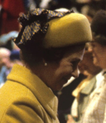 My thanks to Jimbo for hunting down the 1978 photo! This series shows another interesting evolution in the Queen’s hat shapes- the voluminous turbans of the late 1960s and 1970s are intermixed with equally inflated fabric tam ‘o shanters. The early 1980s sees a series of embellished pillboxes with two brimmed designs: the lovely floral trimmed fedora of 1984 and the low-crowned cowgirl design (with veil!) in 1983 . It’s simply a colourful bunch that makes me smile!