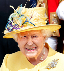 Queen Elizabeth’s yellow straw hat with bows and colourful feathers by Rachel Trevor Morgan worn April 18
