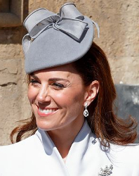 Duchess of Cambridge’s grey felt Jane Taylor teardrop with organdie bows worn April 21