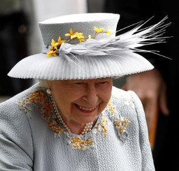 Queen Elizabeth blue hat with peaked brim and velvet flowers by Angela Kelly worn on Day 1