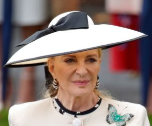 Princess Michael of Kent’s ivory picture hat with black brim piping and bow worn on Day 3