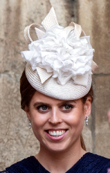 Princess Beatrice’s white parasisal button percher with flowers & bows by Jess Collett worn May 18