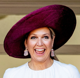 Queen Máxima’s deep mulberry straw picture hat with soaring ‘slice’ brim by Fabienne Delvigne worn May 30