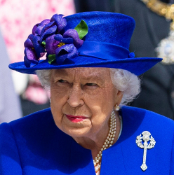 Queen Elizabeth’s royal blue straw Rachel Trevor Morgan design with purple flowers worn June 29