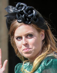 Princess Beatrice’s black leather halo bandeau with feathers by Justine Bradley-Hill worn August 31
