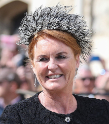 Sarah, Duchess of York’s black bumper hat with Lady Amherst feather trim by Jess Collett worn August 31