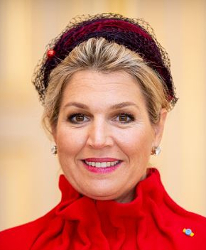 Queen Máxima’s burgundy velvet ruched calot with black veil overlay by Fabienne Delvigne worn Oct 29