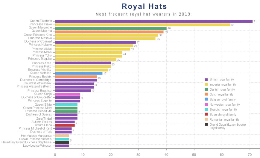 These numbers include the same grey areas I described in the first statistics post but still give a very interesting picture of the frequency that various royal women wear hats. There are a few surprises here – Princess Hisako at #2, the high number of Imperial royals at the top of the chart, the number of European queens below mid-range. What do you notice about these numbers?