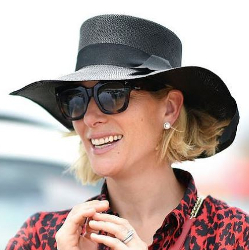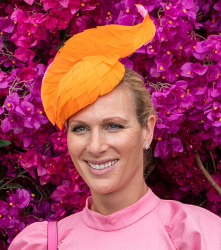 Zara Tindall in a wave trimmed teardrop percher covered in orange and pink feathers by Millinery Jill worn Jan 11