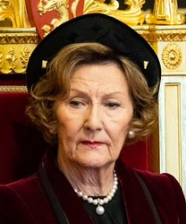 Queen Sonja repeated her black capulet hat with close fitting cloche crown and upturned front brim. The brim follows a slightly peaked shape with central point and is printed (or embroidered?) with diamond shapes on the undersideIt’s difficult to assess this hat without a better view but the shape of the hat, from front view, works well with Sonja’s hairstyle and regally frames her face in a sort of modern kokoshnik.