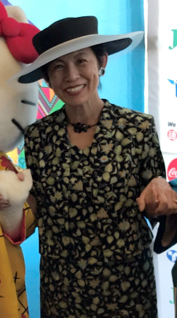 Look #2: With a textured straw black saucer hat with raised pyramid center worn July 27,2017 for an international calligraphy exhibition in Tokyo