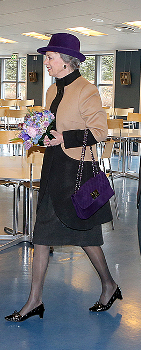 One of the hats that fared well in our recent repeated hats poll was Princess Benedikte’s purple felt trilby. She has added two different hatbands to this hat and paired it with four ensembles: