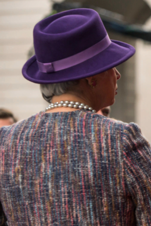 The magenta works nicely with the purple in outfit #2, and I’m also impressed how she matched the hat with the purple on the natty gentleman’s wheelchair.