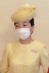Princess Akiko’s pale yellow bumper hat with crin wrap and flowers at the back worn Nov 8