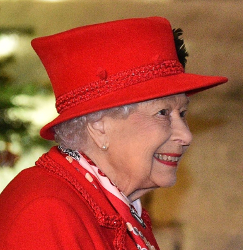 Queen Elizabeth’s red hat by Angela Kelly with teardrop crown and braided hatbands worn Dec 8