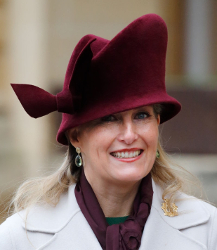 The Countess of Wessex’s maroon tall cloche with bow by Philip Treacy worn Dec 10