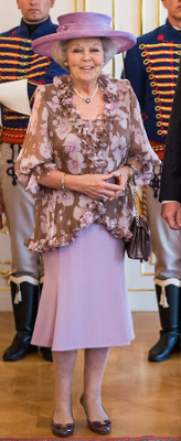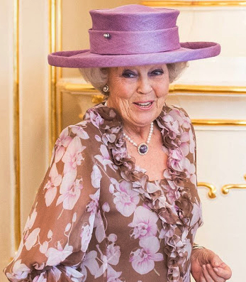 To mark Princess Beatrix’s 83rd birthday yesterday, we’re taking a closer look a lilac straw hat with wide kettle brim she has paired with three floral ensembles: