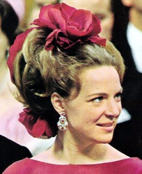 Princess Irene wore a headpiece of large deep pink silk flowers. Princess Margriet wore a white veiled pillbox, the fur hat linking with the collar and cuffs on her blush silk gown and coat.