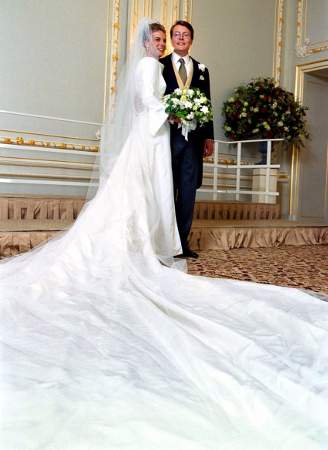 Hmm, I’ve never taken a good look at this gown before. I favor wedding gowns with sleek lines and minimal ornamentation, so this works! The length of the train and veil are a little overwhelming, and the sleeves could have been more gradually tapered, but overall this is a good look for a modern Princess.