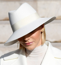 What a great trio, especially from someone who wears a hat just a few times each year. While the quintessentially French rose-trimmed pyramid is one of my all time favourites in Charlene’s hat closet (and was our top royal hat pick in 2016), the lovely lines of both the ecru beret and the white fedora warrant our admiration.